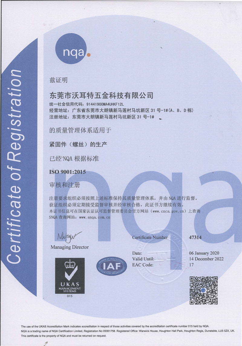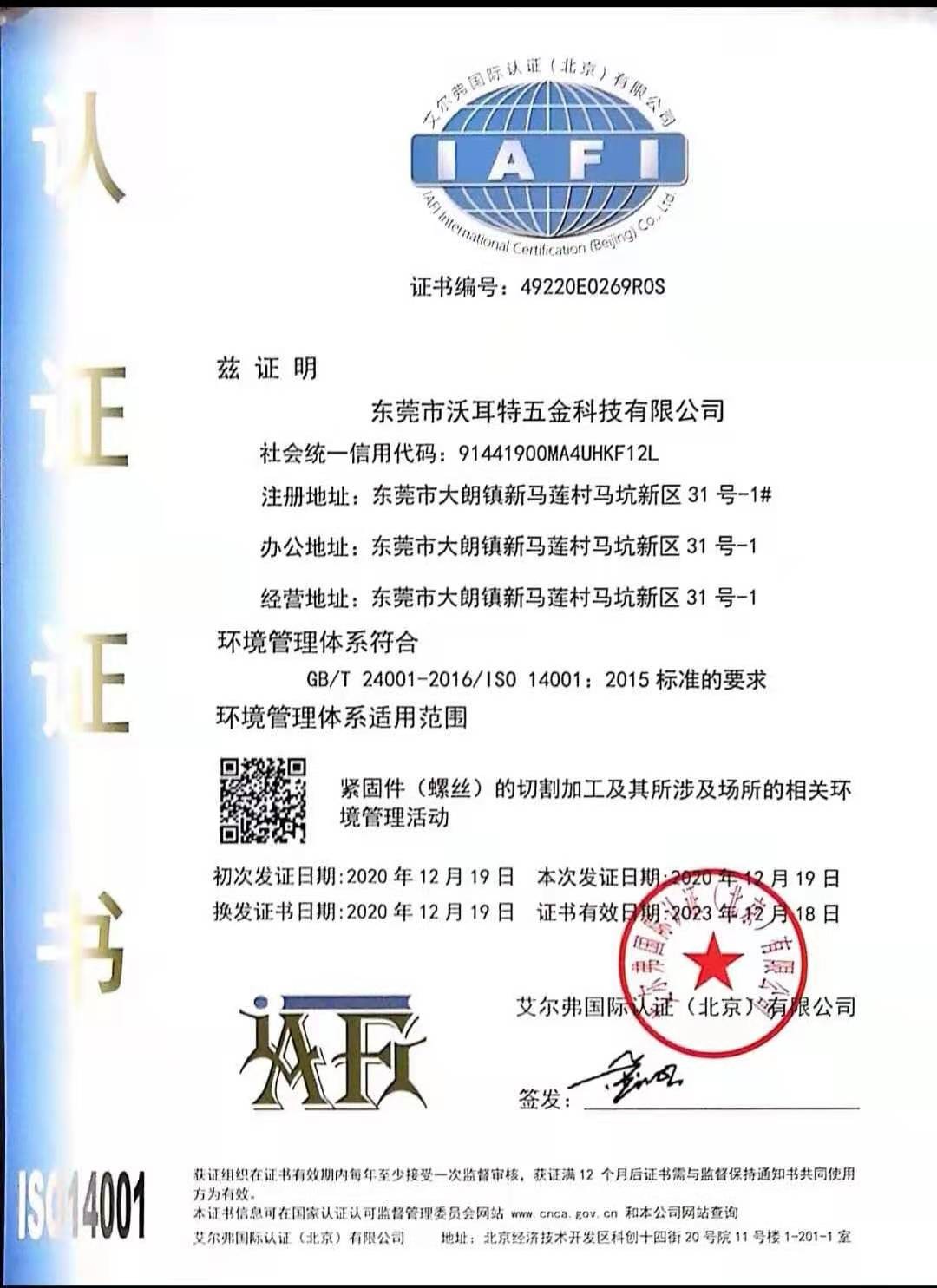 东莞市沃耳特五金科技有限公司成立于2015年,是集开发、设计、生产销售、服务于一体的生产型企业。专业生产螺丝、螺母、CNC零部件及各类精密紧固件,目前公司已经通过IATF 16949、ISO9001、ISO14001等体系认证。